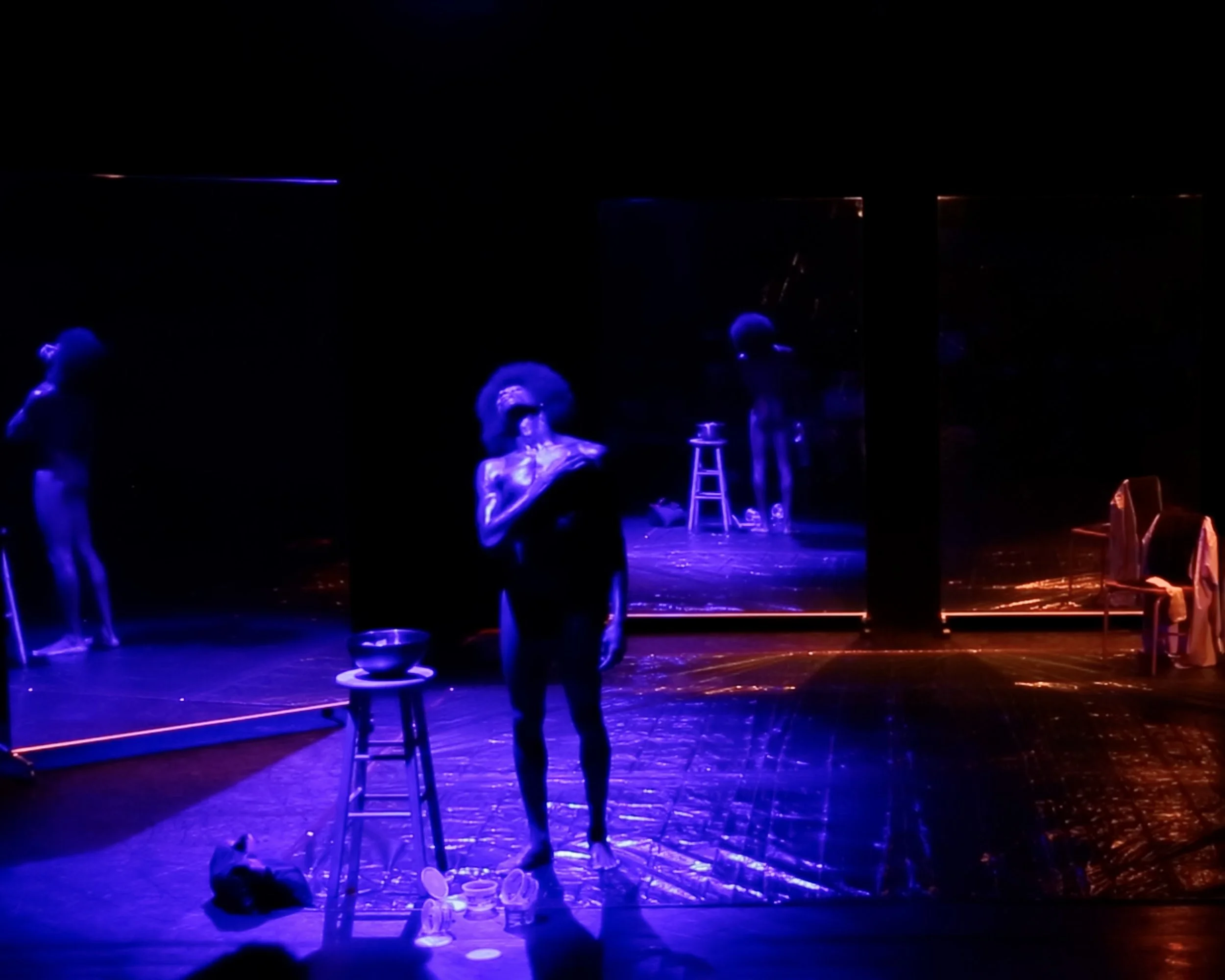 Four 8×6 ft mirrors reflect the audience’s view back unto itself. Does my Blackness bother you? A question subconsciously posed by the work as they watch themselves watching me.